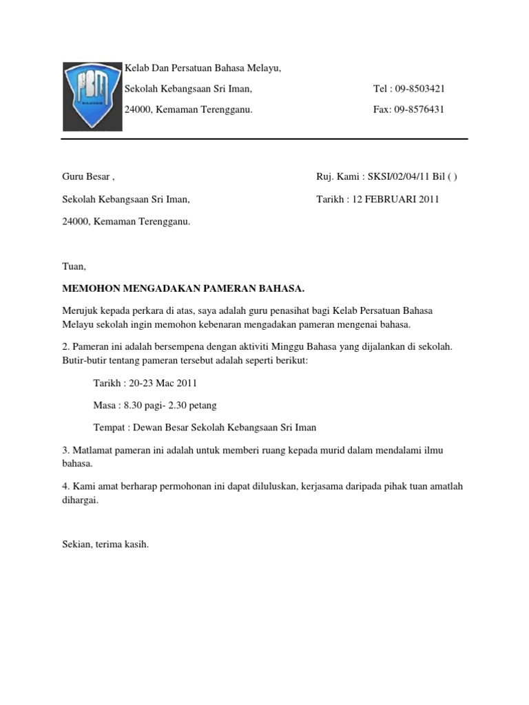 Contoh Surat Rasmi Permohonan Aktiviti Kelab Dan Persatuan Bahasa
